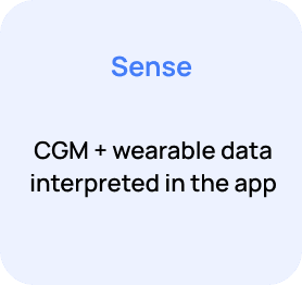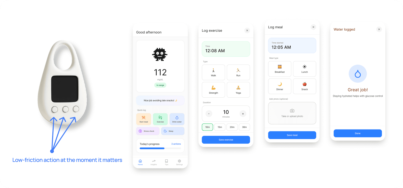 The app interprets CGM and wearable data to generate personalized nudges, while the physical companion enables quick, low-friction action when phone interactions feel intrusive.