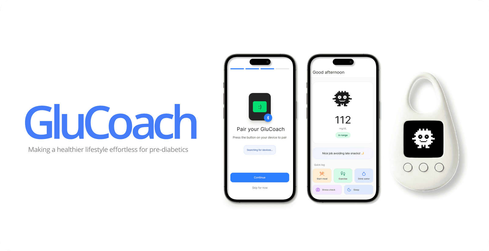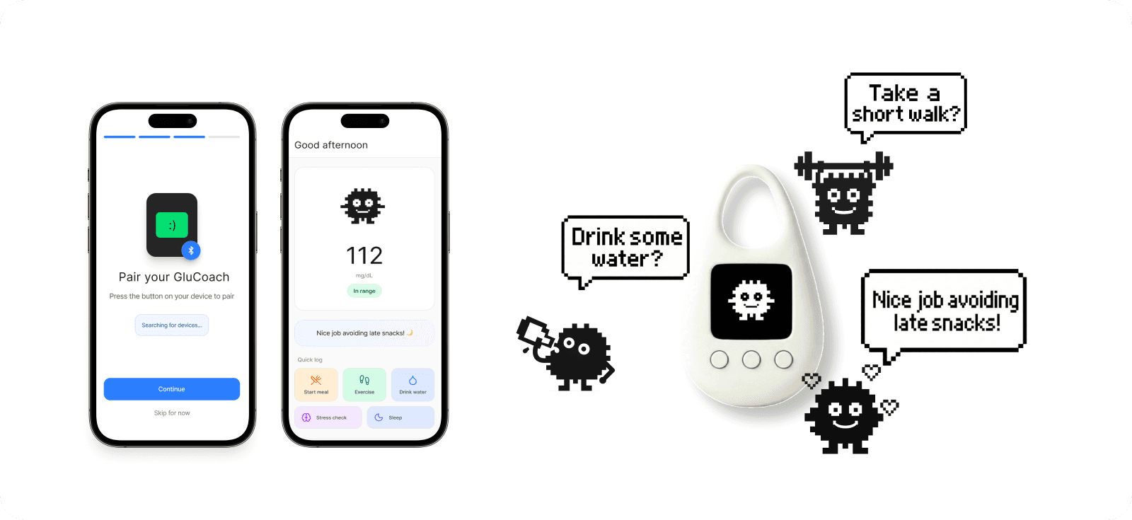 GluCoach is designed as a mobile app and physical companion that function together as a single behavioral system.